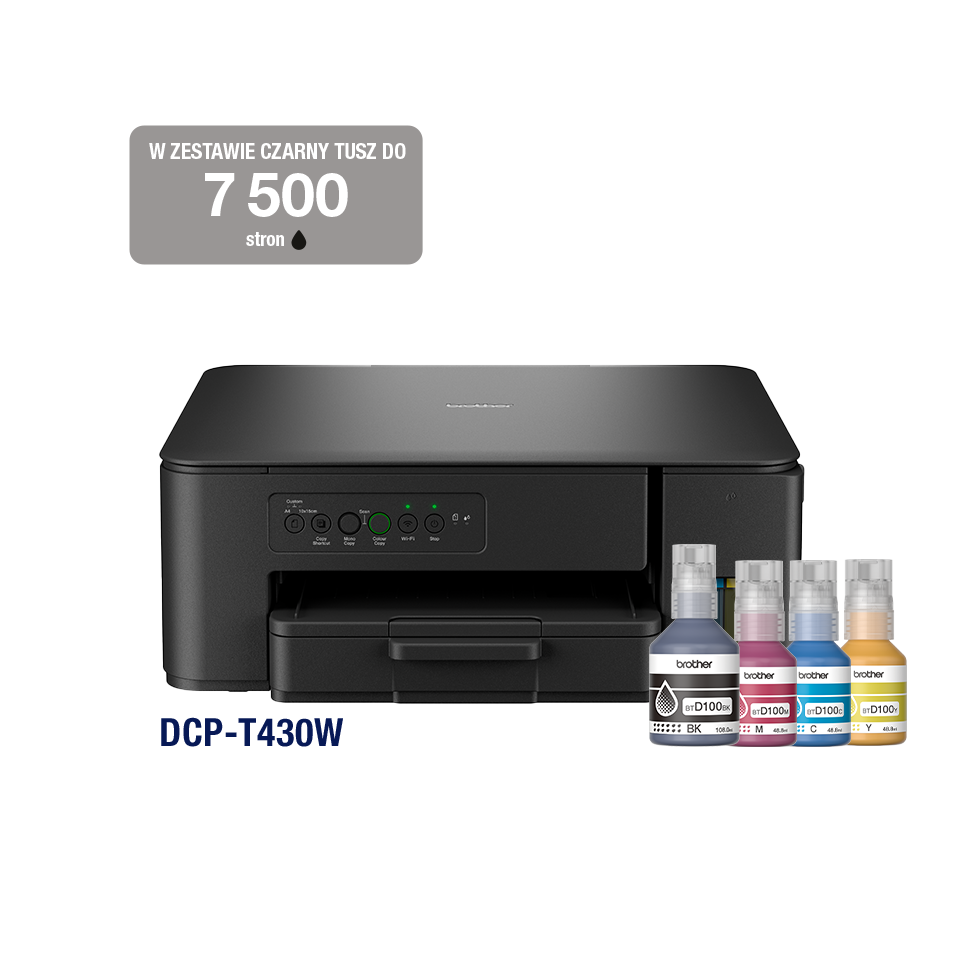 - Wraz z urządzeniem DCP-T430W otrzymasz butelki atramentów w kolorach: czarnym (wydajność do 7500 stron*), cyjan (wydajność do 5000 stron*), magenta (wydajność do 5000 stron*) oraz żółtym (wydajność do 5000 stron*). Usprawni to Twoją pracę i znacznie obniży koszty druku.